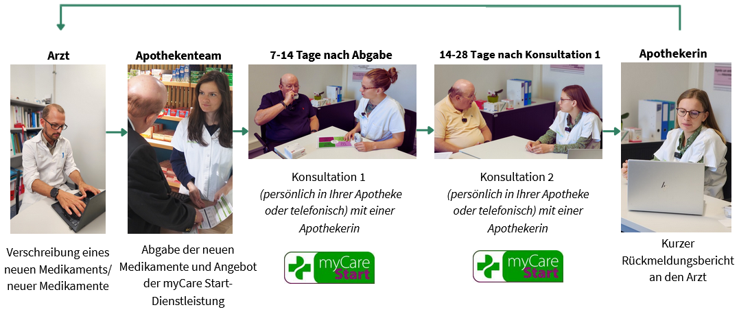 myCare Start ist eine evidenzbasierter „Gesundheitsdienstleistung“ in der Schweiz, die Patient:innen, die eine neue Langzeitbehandlung starten, begleitet. Diese Dienstleistung wurde gemeinsam mit Ärzten entwickelt, um sie in Apotheken in der näheren Umgebung zu integrieren. Ihr Ziel ist es, Patientinnen beim Behandlungsbeginn zu unterstützen, die Medikamentenadhärenz zu fördern und die Kommunikation zwischen den Gesundheitsfachkräften zu verbessern. Die Gespräche finden in den ersten sechs Wochen nach Behandlungsstart statt und sollen Sie in dieser entscheidenden Phase begleiten.