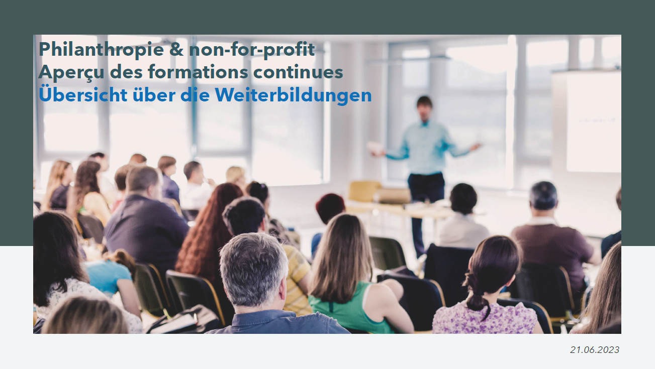 Grâce au soutien de SwissFoundations et proFonds, le GCP est heureux de vous présenter les formations en lien avec la philanthropie et le secteur à but non lucratif en Suisse. Notre base de données, consultable ici, se veut évolutive; les formations en lien avec la philanthropie seront ajoutées au fur et à mesure de leur création et disponible ici.
