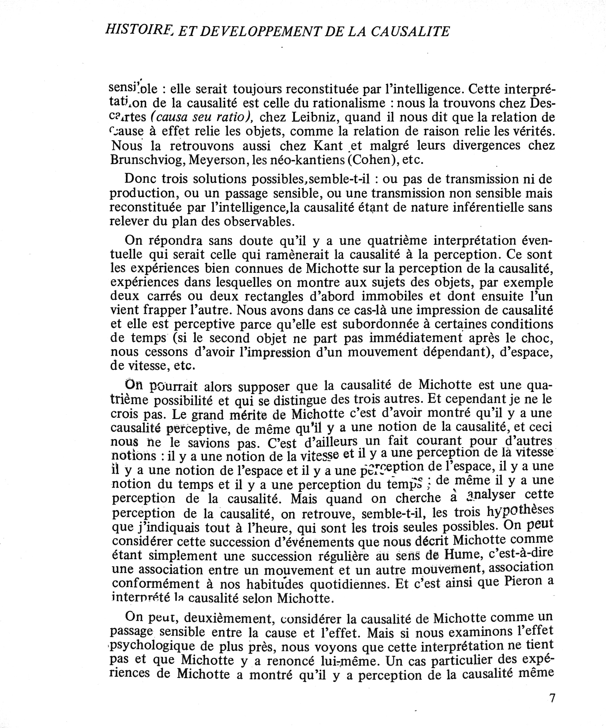Je conclus donc quâil nây a que trois formes dâinterprĂ©tation de la causalitĂ© et que mĂȘme dans le cas de la causalitĂ© perceptive de Michotte, il faut se dĂ©cider entre lâassociation, le passage sensible, ou troisiĂšmement la reconstitution, la composition prĂ©-infĂ©rentielle. Vous savez que Helmholtz a parlĂ© dâinfĂ©rences perceptives et, avec Pavlov, je crois quâil a raison. Il y a des prĂ©-infĂ©rences perceptives comme il y a des infĂ©rences notionnelles ; mĂȘme sur ce plan nous avons affaire Ă quelque chose qui nâest pas directement observable mais Ă une reconstitution. Je classerais donc cela dans la troisiĂšme des solutions dont je reparlerai tout Ă lâheure.