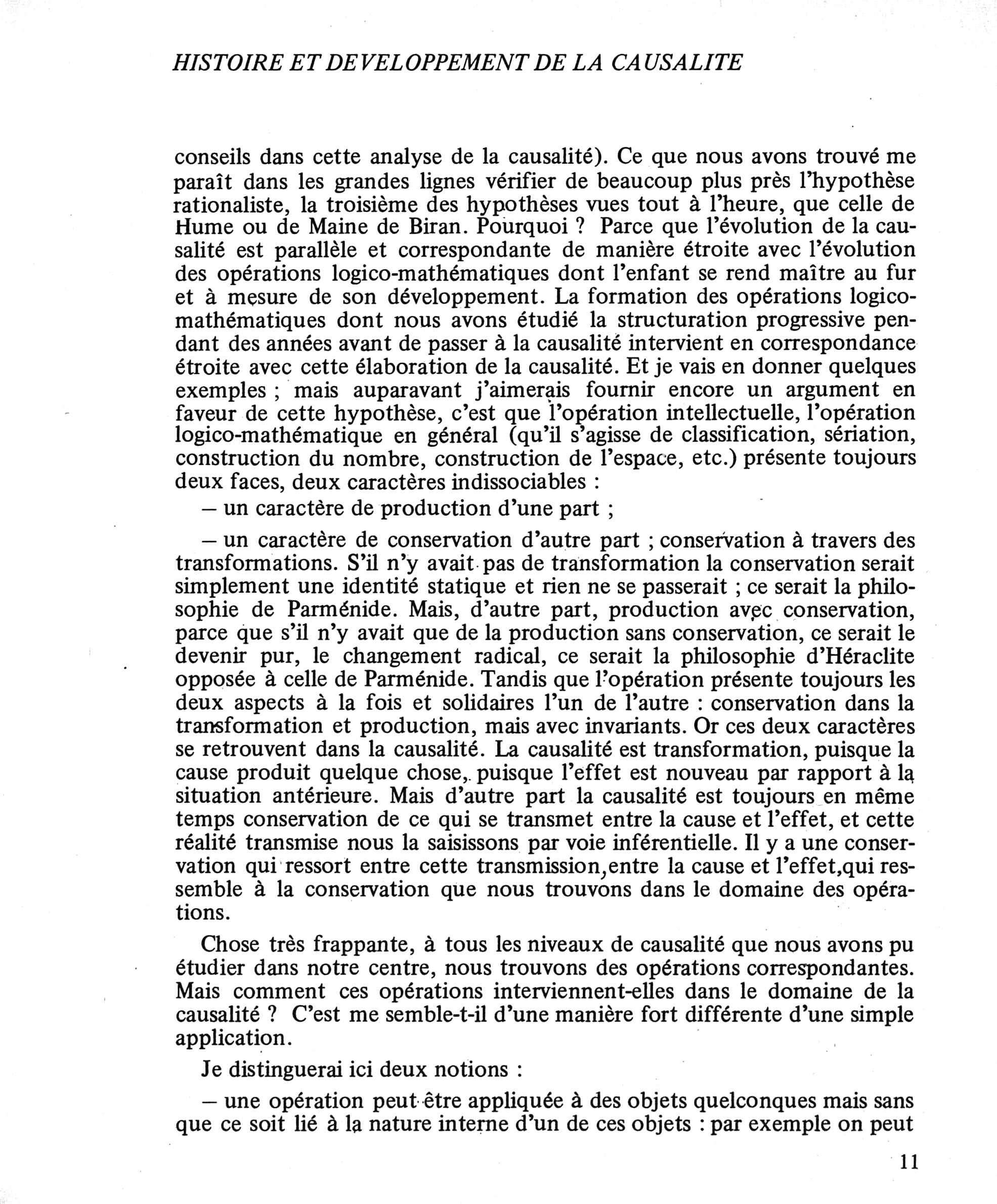 â un caractĂšre de conservation dâautre part ; conservation Ă travers des transformations. Sâil nây avait pas de transformation la conservation serait simplement une identitĂ© statique et rien ne se passerait ; ce serait la philosophie de ParmĂ©nide. Mais, dâautre part, production avec conservation, parce que sâil nây avait que de la production sans conservation, ce serait le devenir pur, le changement radical, ce serait la philosophie dâHĂ©raclite opposĂ©e Ă celle de ParmĂ©nide. Tandis que lâopĂ©ration prĂ©sente toujours les deux aspects Ă la fois et solidaires lâun de lâautre : conservation dans la transformation et production, mais avec invariants. Or ces deux caractĂšres se retrouvent dans la causalitĂ©. La causalitĂ© est transformation, puisque la cause produit quelque chose, puisque lâeffet est nouveau par rapport Ă la situation antĂ©rieure. Mais dâautre part la causalitĂ© est toujours en mĂȘme temps conservation de ce qui se transmet entre la cause et lâeffet, et cette rĂ©alitĂ© transmise nous la saisissons par voie infĂ©rentielle. Il y a une conservation qui ressort entre cette transmission, entre la cause et lâeffet, qui ressemble Ă la conservation que nous trouvons dans le domaine des opĂ©rations.