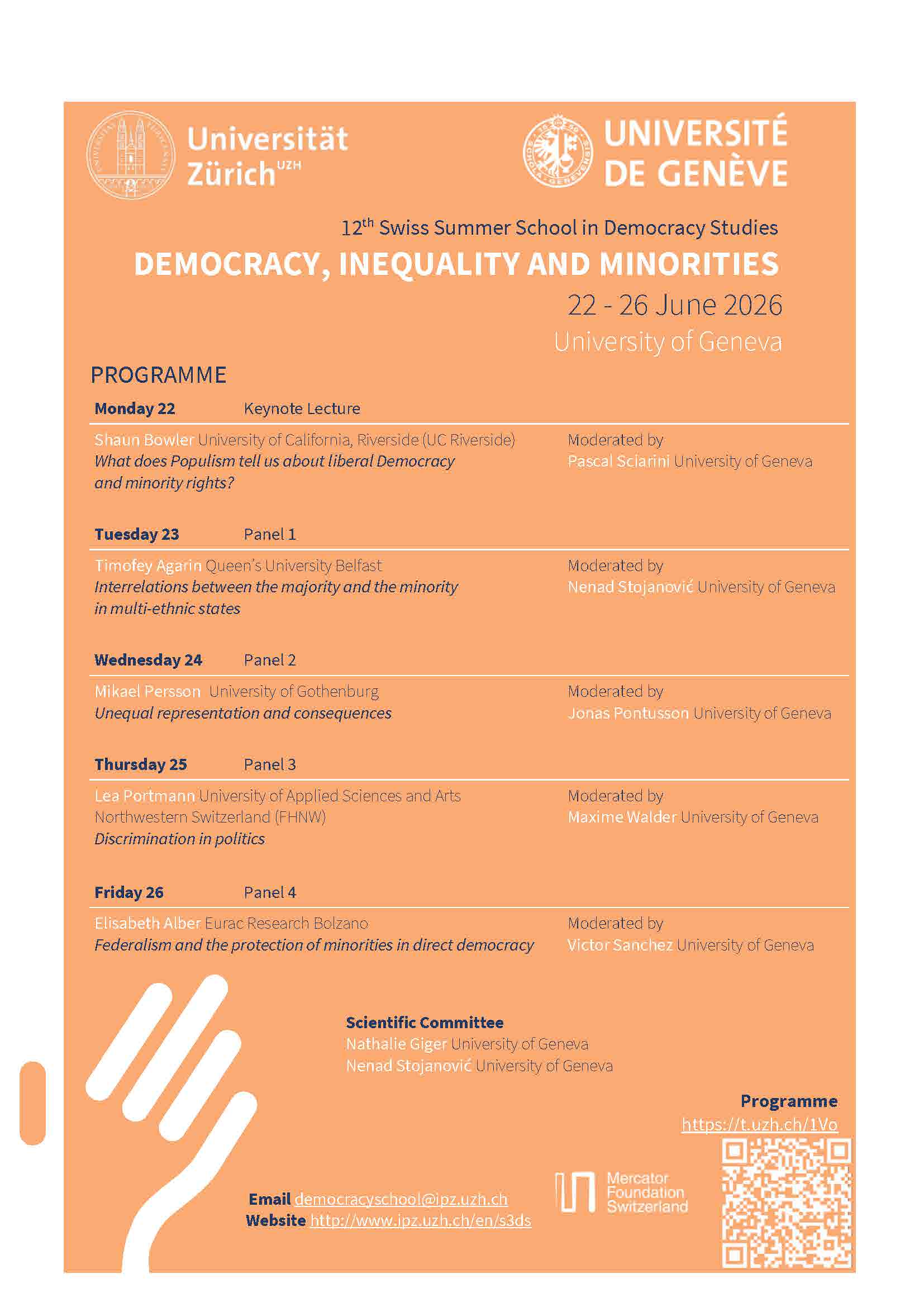 - "Democracy, inequality and minorities", Swiss Summer School in Democracy Studies, 22-26.06.2026. (PDF)
