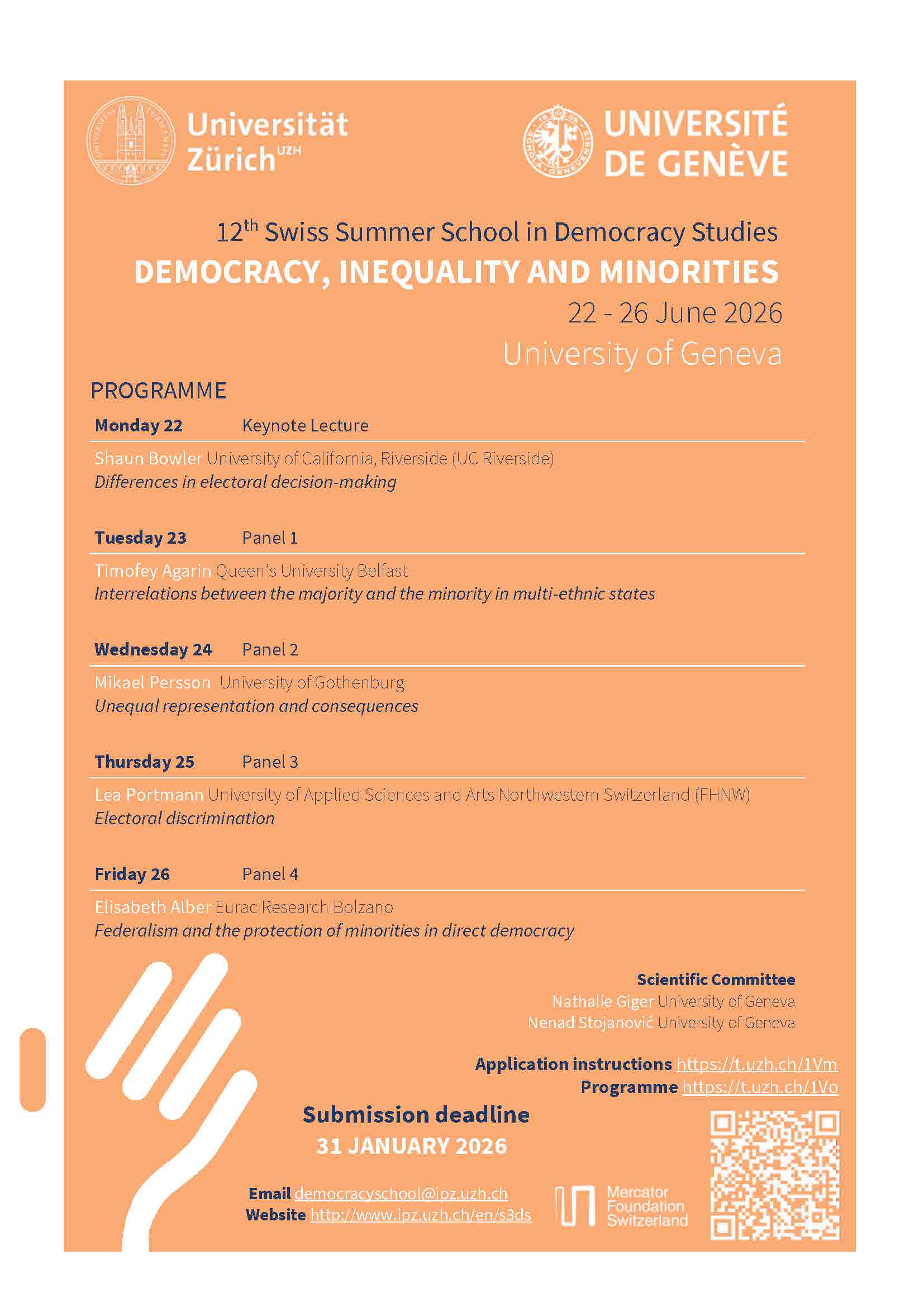 - "Democracy, inequality and minorities", Swiss Summer School in Democracy Studies, 22-26.06.2026. (PDF)