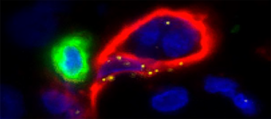 Coupe de mélanome humain montrant l’expression de l’enzyme CH25H (en jaune) par les cellules endothéliales lymphatiques (en rouge, les vaisseaux lymphatiques), et leur interaction avec une cellule immunitaire anti-tumorale (en vert). © David Tarussio