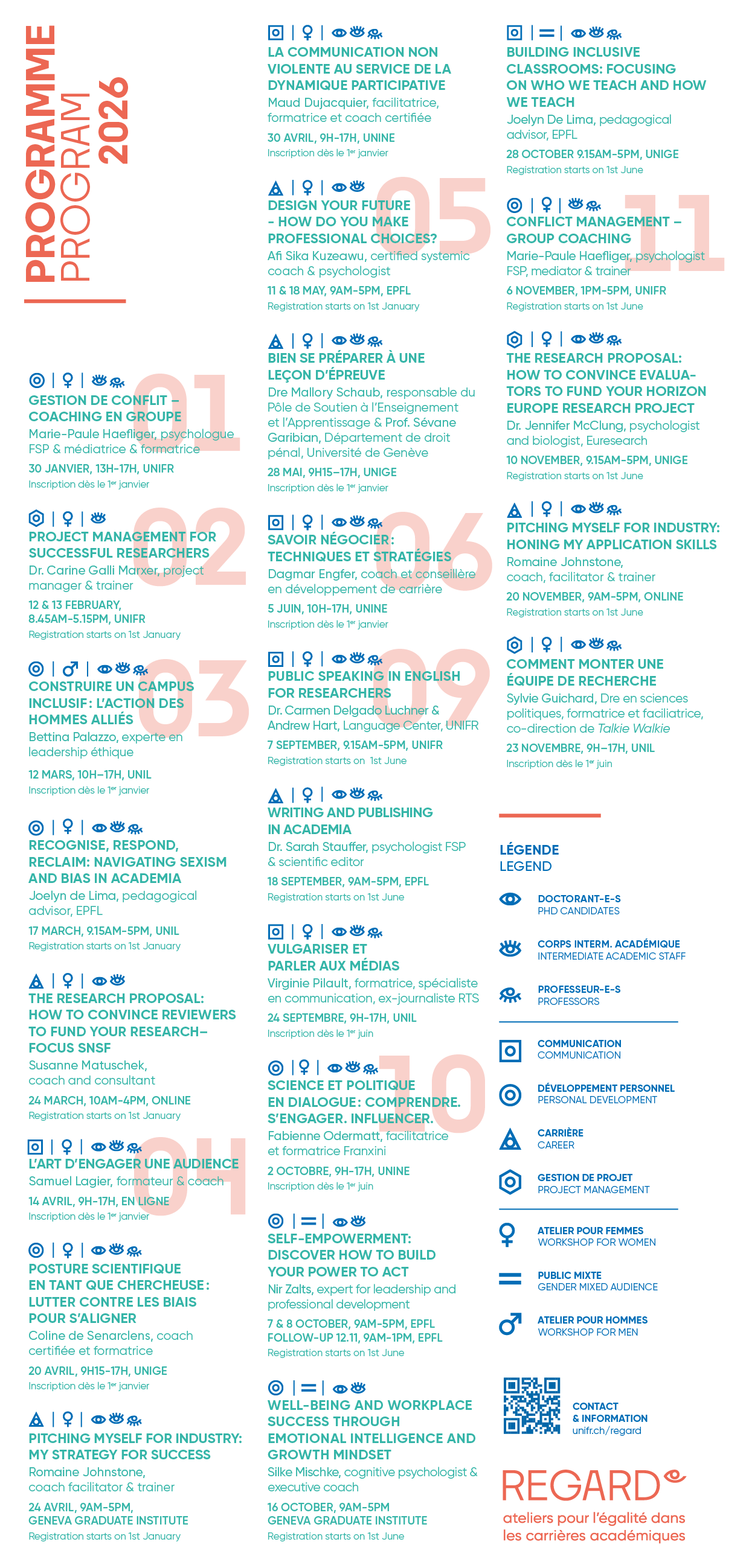 Les ateliers du programme REGARD vous offrent des outils concrets pour la gestion de votre carrière académique ainsi que pour développer vos compétences transversales avec d'autres chercheuses des universités partenaires. De plus, les ateliers créent des espaces de discussion et d'échange d'expériences entre chercheuses.