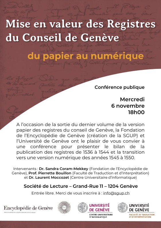 A l’occasion de la sortie du dernier volume de la version papier des registres du conseil de Genève, la Fondation de l’Encyclopédie de Genève (création de la SGUP) et l’Université de Genève ont donné une conférence à la Société de Lecture de Genève pour présenter le bilan de la publication des registres de 1536 à 1544 et la transition vers une version numérique des années 1545 à 1550.