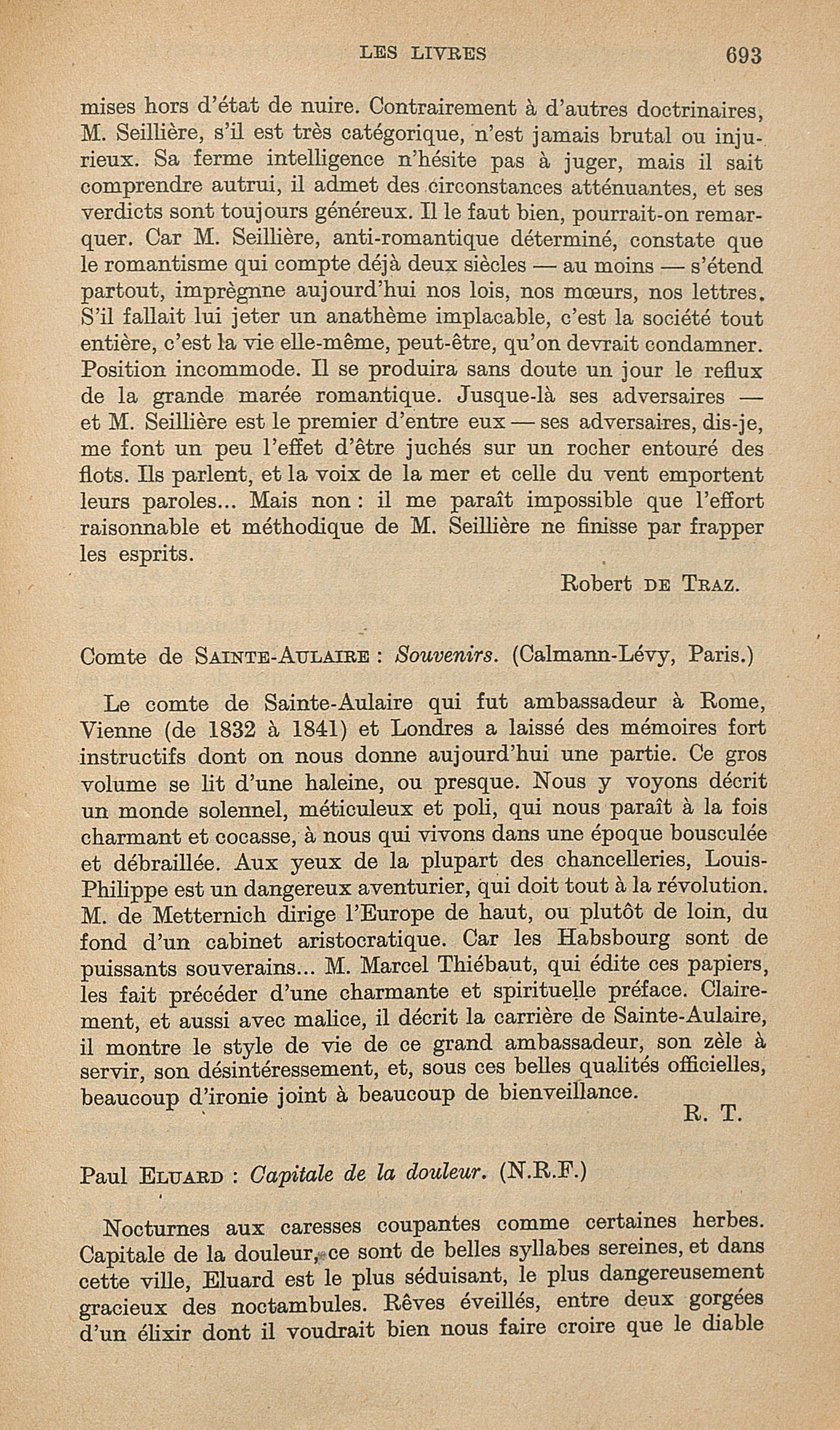 Nocturnes aux caresses coupantes comme certaines herbes. Capitale de la douleurb, ce sont de belles syllabes sereines, et dans cette ville, Éluard est le plus séduisant, le plus dangereusement gracieux des noctambules. Rêves éveillés, entre deux gorgées d’un élixir dont il voudrait bien nous faire croire que le diable [p. 694] est l’auteur. Beaucoup d’oiseaux volètent, se balancent au bord des verres, se posent sur les cordes d’une lyre dont ils font grésiller l’accord, une patte en l’air, becquètent le cœur d’une femme qui va les étrangler doucement. Ces vers sont de jolies flèches empoisonnées. Quelque chose, tout de même, de laqué, d’élégant, de « bien français » ; et le mot sang n’évoque ici qu’une tache de couleur, plus sentimental que cruel. « J’ai la beauté facile et c’est heureux. » Il y a aussi un certain tragique, mais au filet si acéré qu’on ne sent presque pas sa blessure.