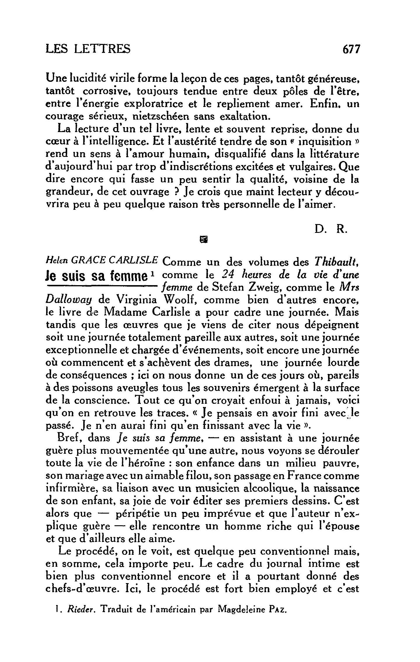 La lecture d’un tel livre, lente et souvent reprise, donne du cœur à l’intelligence. Et l’austérité tendre de son « inquisition » rend un sens à l’amour humain, disqualifié dans la littérature d’aujourd’hui par trop d’indiscrétions excitées et vulgaires. Que dire encore qui fasse un peu sentir la qualité, voisine de la grandeur, de cet ouvrage ? Je crois que maint lecteur y découvrira peu à peu quelque raison très personnelle de l’aimer.