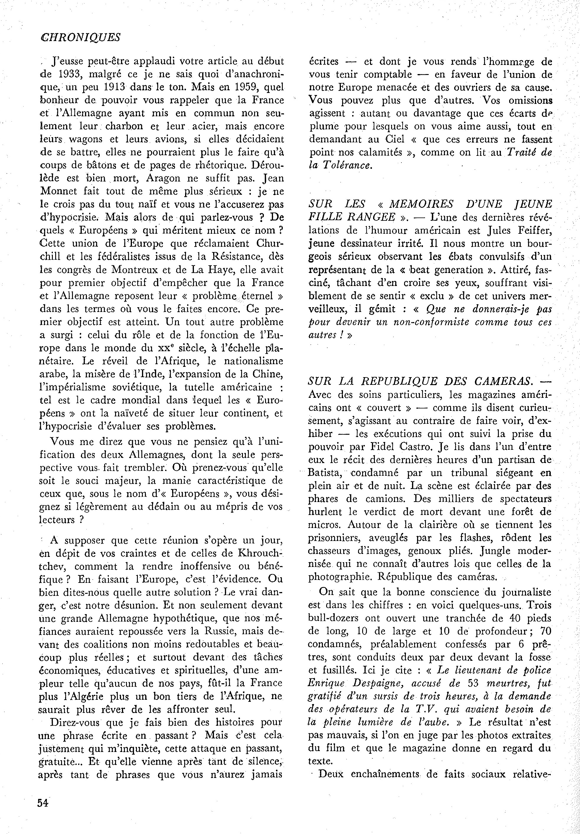 [p. 54] J’eusse peut-être applaudi votre article au début de 1933, malgré ce je ne sais quoi d’anachronique, un peu 1913 dans le ton. Mais en 1959, quel bonheur de pouvoir vous rappeler que la France et l’Allemagne ayant mis en commun non seulement leur charbon et leur acier, mais encore leurs wagons et leurs avions, si elles décidaient de se battre, elles ne pourraient plus le faire qu’à coups de bâtons et de pages de rhétorique. Déroulède est bien mort, Aragon ne suffit pas. Jean Monnet fait tout de même plus sérieux : je ne le crois pas du tout naïf et vous ne l’accuserez pas d’hypocrisie. Mais alors de qui parlez-vous ? De quels « Européens » qui méritent mieux ce nom ? Cette union de l’Europe que réclamaient Churchill et les fédéralistes issus de la Résistance, dès les congrès de Montreux et de La Haye, elle avait pour premier objectif d’empêcher que la France et l’Allemagne reposent leur « problème éternel » dans les termes où vous le faites encore. Ce premier objectif est atteint. Un tout autre problème a surgi : celui du rôle et de la fonction de l’Europe dans le monde du xxe siècle, à l’échelle planétaire. Le réveil de l’Afrique, le nationalisme arabe, la misère de l’Inde, l’expansion de la Chine, l’impérialisme soviétique, la tutelle américaine : tel est le cadre mondial dans lequel les « Européens » ont la naïveté de situer leur continent, et l’hypocrisie d’évaluer ses problèmes.