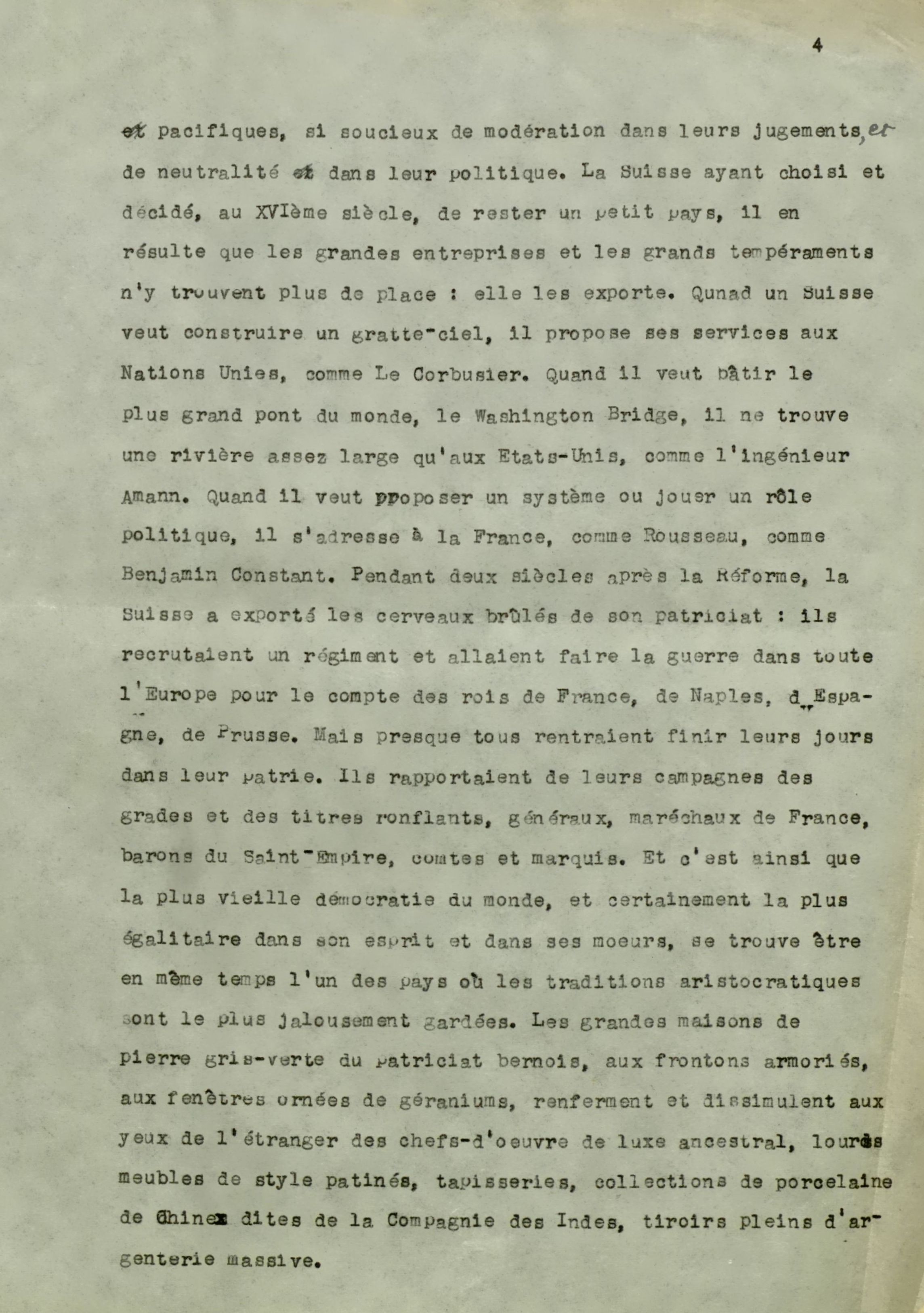 Il ne faut jamais oublier ce passé glorieux et turbulent quand on voit les Suisses d’aujourd’hui, si calmes et [p. 4] pacifiques, si soucieux de modération dans leurs jugements, et de neutralité dans leur politique. La Suisse ayant choisi et décidé, au xvie siècle, de rester un petit pays, il en résulte que les grandes entreprises et les grands tempéraments n’y trouvent plus de place : elle les exporte. Quand un Suisse veut construire un gratte-ciel, il propose ses services aux Nations unies , comme Le Corbusier. Quand il veut bâtir le plus grand pont du monde, le Washington Bridge, il ne trouve une rivière assez large qu’aux États-Unis, comme l’ingénieur Amann. Quand il veut proposer un système ou jouer un rôle politique, il s’adresse à la France, comme Rousseau, comme Benjamin Constant. Pendant deux siècles après la Réforme, la Suisse a exporté les cerveaux brûlés de son patriciat : ils recrutaient un régiment et allaient faire la guerre dans toute l’Europe pour le compte des rois de France, de Naples, d’Espagne, de Prusse. Mais presque tous rentraient finir leurs jours dans leur patrie. Ils rapportaient de leurs campagnes des grades et des titres ronflants, généraux, maréchaux de France, barons du Saint-Empire, comtes et marquis. Et c’est ainsi que la plus vieille démocratie du monde, et certainement la plus égalitaire dans son esprit et dans ses mœurs, se trouve être en même temps l’un des pays où les traditions aristocratiques sont le plus jalousement gardées. Les grandes maisons de pierres gris-vert du patriciat bernois, aux frontons armoriés, aux fenêtres ornées de géraniums, renferment et dissimulent aux yeux de l’étranger des chefs-d’œuvre de luxe ancestral, lourds meubles de style patinés, tapisseries, collections de porcelaine de Chine dites de la Compagnie des Indes, tiroirs pleins d’argenterie massive.