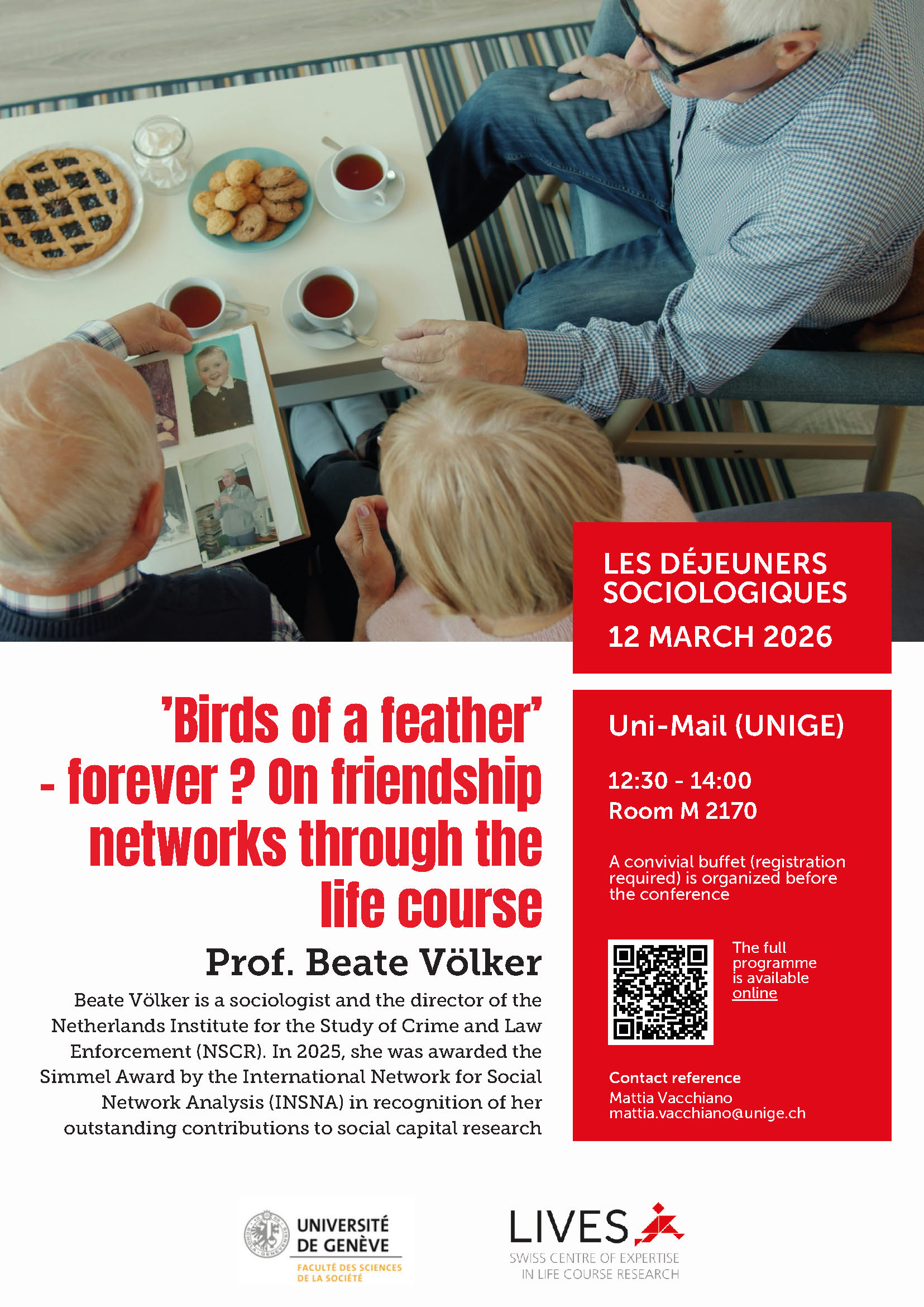 You are warmly invited to the first session of this semester’s sociological lunches (Les déjeuners sociologiques). The Institute of Sociological Research and LIVES will host as special guest Professor Beate Völker (UV Amsterdam), who was recently awarded the Simmel Award in recognition of her outstanding contribution to social capital research.