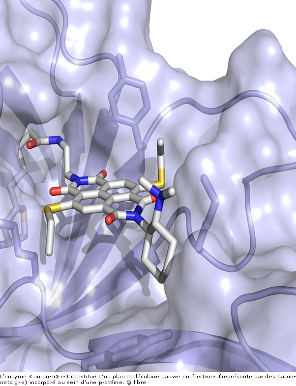 La nature utilise ces interactions cation-π pour préparer des molécules aussi importantes que les stéroïdes, les hormones, les vitamines, les pigments visuels ou les fragrances, traduire des signaux dans le cerveau, reconnaître les antigènes, etc. En utilisant leur nouveau cofacteur et la protéine artificielle obtenue, les équipes de Matile et de Ward ont collaboré pour créer le premier enzyme « anion-π », dans lequel ce plan moléculaire riche en électrons est remplacé par un plan pauvre en électrons afin de stabiliser une charge non plus positive mais négative pendant une transformation moléculaire. Des protéines dotées de cette nouvelle fonctionnalité, inédite dans la nature, ont réussi à faire mieux que les catalyseurs traditionnels. Les chercheurs estiment à présent que leur approche peut être transposée aux cellules et permettre ainsi de réaliser d’autres transformations chimiques actuellement impossibles.