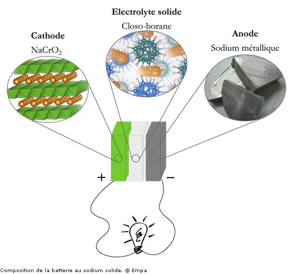 «Mais il nous fallait encore trouver un conducteur ionique solide approprié qui soit stable chimiquement, thermiquement, non toxique, et qui permette au sodium de se déplacer facilement entre l’anode et la cathode», explique Hans Hagemann, professeur au Département de chimie physique de la Faculté des sciences de l’UNIGE. Les chercheurs ont ainsi découvert qu’une substance à base de bore, le closoborane, permet non seulement une bonne circulation du sodium, mais encore est un conducteur non organique, ôtant de ce fait tout risque d’inflammabilité de la batterie lors de la recharge. Un matériau aux nombreuses propriétés prometteuses.