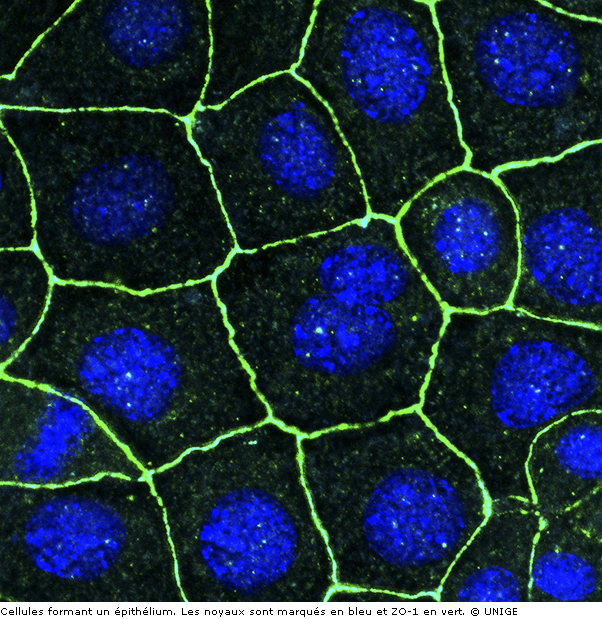 Les cellules épithéliales, qui sont reliées les unes aux autres grâce à des jonctions intercellulaires, un réseau de protéines plus ou moins resserré, constituent les glandes de l’organisme et revêtent les structures creuses et la surface du corps. Ces cellules peuvent par exemple absorber de l’eau et des solutés au niveau des reins, produire du lait au niveau des glandes mammaires ou résister au stress mécanique lors du remplissage et de la vidange de la vessie. Comprendre le fonctionnement des épithéliums constitue un enjeu de taille, tant dans des conditions saines que cancéreuses, car la majorité des tumeurs se développent à partir de cellules épithéliales.