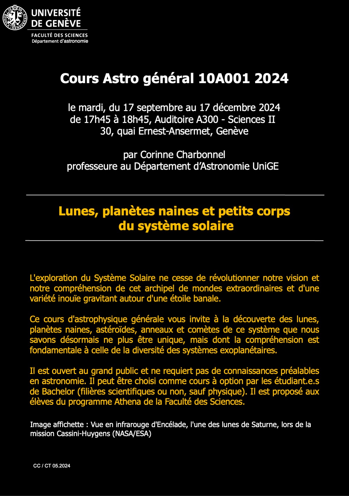Le cours ne requiert pas de connaissances préalables en astronomie. Il est ouvert au grand public et ne requiert pas de connaissances préalables en astronomie. Il peut être choisi comme cours à option par les étudiant.e.s de Bachelor (filières scientifiques ou non, sauf physique). Il est proposé aux élèves du programme Athena de la Faculté des Sciences.
