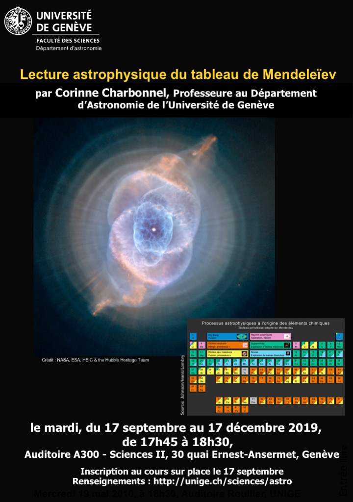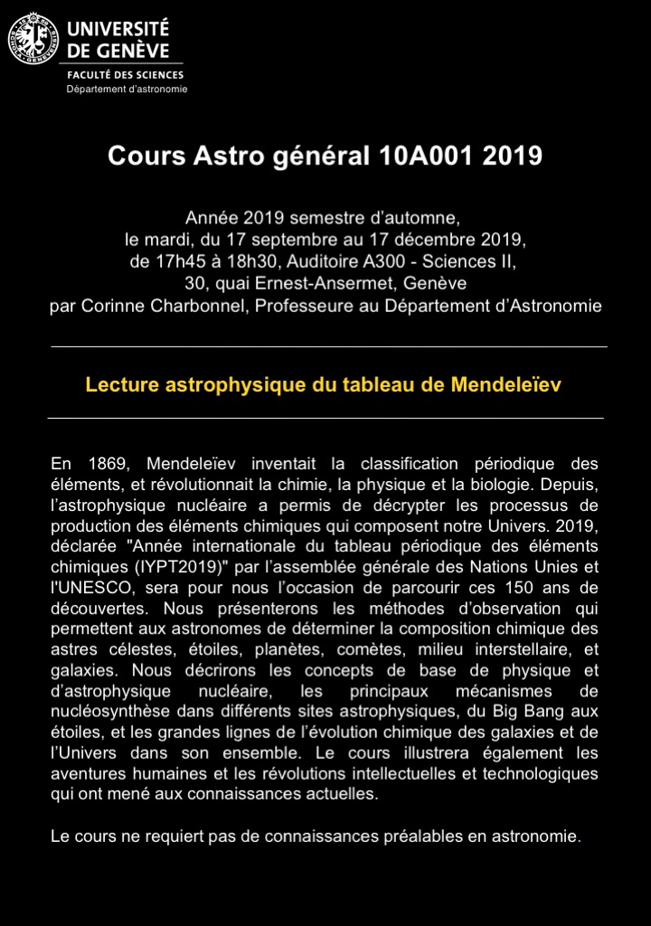 En 1869, Mendeleïev inventait la classification périodique des éléments, et révolutionnait la chimie, la physique et la biologie. Depuis, l’astrophysique nucléaire a permis de décrypter les processus de production des éléments chimiques qui composent notre Univers. 2019, déclarée "Année internationale du tableau périodique des éléments chimiques (IYPT2019)" par l'Assemblée générale des Nations Unies et l'UNESCO, sera pour nous l’occasion de parcourir ces 150 ans de découvertes. Nous présenterons les méthodes d’observation qui permettent aux astronomes de déterminer la composition chimique des astres célestes, étoiles, planètes, comètes, milieu interstellaire, et galaxies. Nous décrirons les concepts de base de physique et d’astrophysique nucléaire, les principaux mécanismes de nucléosynthèse dans différents sites astrophysiques, du Big Bang aux étoiles, et les grandes lignes de l’évolution chimique des galaxies et de l’Univers dans son ensemble. Le cours illustrera également les aventures humaines et les révolutions intellectuelles et technologiques qui ont mené aux connaissances actuelles.
