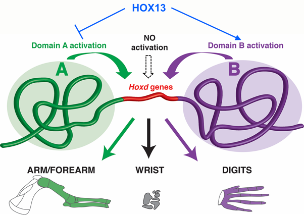 During embryonic life, the emergence of body limbs is orchestrated by a family of architect genes, which are themselves regulated by two DNA structures. While the first presides over the construction of the arm, the other takes over for the development of the hand. Geneticists from the University of Geneva (UNIGE) and the Swiss Federal Institute of Technology in Lausanne (EPFL), Switzerland, show that the same architect proteins, called HOX13 and acting together, complete the formation of the arm and initiate that of the hand, allowing to connect the two processes. As for the region located between the arm and the hand, it escapes the attention of the two regulatory DNA structures, thus providing an opportunity for the wrist bones to develop. The study is published in the journal Genes & Development.