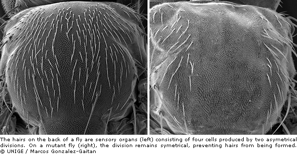 The first clue lies in the fact that the Sara protein is present in the endosomes, which helps them group together on the same side of the cell. When genetically-modified, mutant flies are deprived of the Sara gene — and, by extension, of the protein that it produces — the SOPs divide symmetrically and the hairs do not form; the flies, in other words, have naked backs without hairs. In the first phase of the research, Professor Gonzalez-Gaitan’s team was able to show that the same process occurs in other types of cells, such as intestinal stem cells and even in the vertebrate nervous system, thanks to observations on fish.