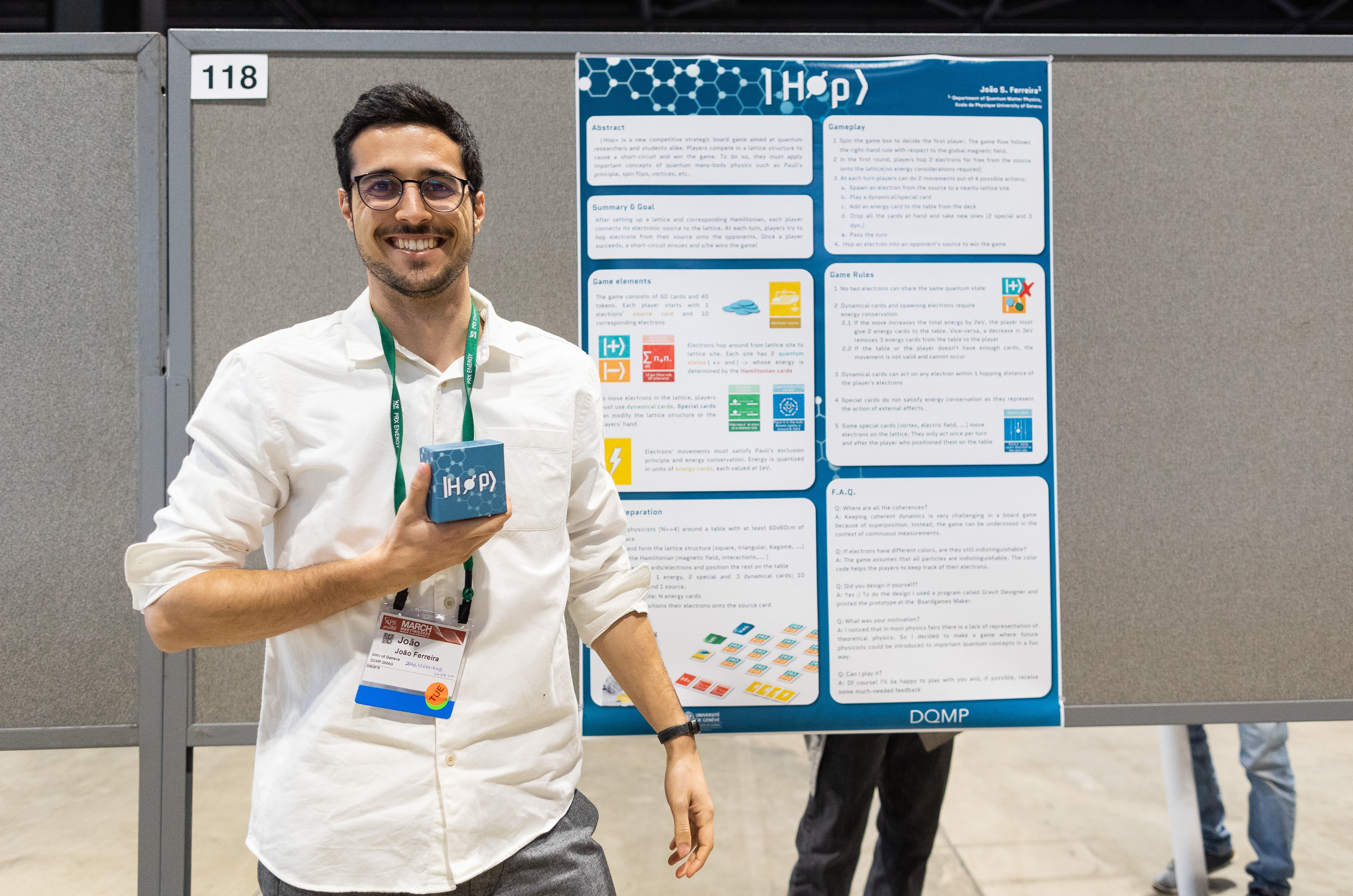 |Hop> est un outil pédagogique pour la physique quantique, à la fois en classe et à la maison. João a commencé à développer ce jeu de cartes parallèlement à sa thèse, dans le but d'expliquer ses recherches et de combler certaines lacunes dans la communauté plus large de la vulgarisation scientifique. Dans ce jeu, le plateau est constitué d'atomes disposés selon une structure cristalline. Chaque joueur commence la partie en plaçant un contact électronique sur le plateau, à partir duquel les électrons vont circuler et sauter dans le cristal. Le but du jeu est de réussir à faire sauter son électron sur le contact d'un adversaire pour créer un court-circuit et gagner la partie. En jouant à ce jeu, vous utilisez sans le savoir des éléments de la mécanique quantique et vous vous familiarisez avec certaines notions.