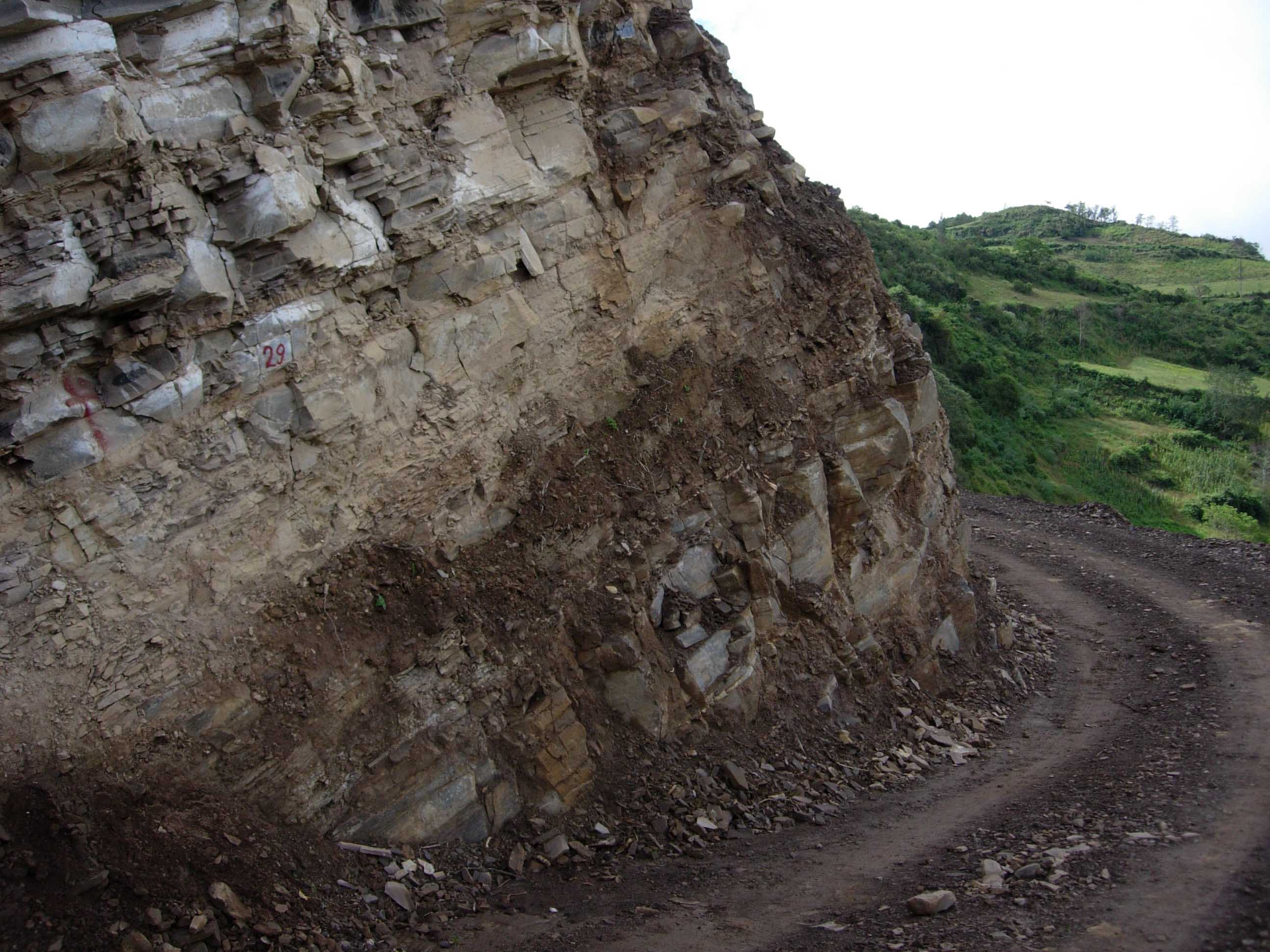 Sediments straddling the Triassic-Jurassic boundary along a fresh road cut in Utcubamba valley, northern Peru. The Triassic-Jurassic boundary is marking the second biggest mass extinction event in Earth s history, which is thought to be the result of significant climate deterioration after a 500 ky period of massive volcanism in the Central Atlantic Magmatic Province. The exact age of the Triassic-Jurassic boundary (201.58 ± 0.17 Ma) has been precisely dated by U-Pb zircon dating techniques in the frame of a research project at the Department of Mineralogy. This new, precise and accurate age determinations provide evidence that basalt flows in eastern United States and Canada are possibly the smoking gun of this mass extinction. The globally disturbed marine ecosystems took 2 million years to recover and get back to the pre-extinction faunal diversity.