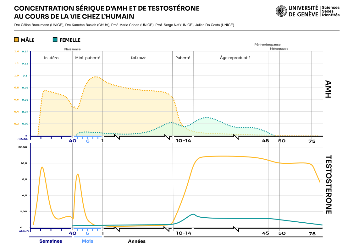 La testostérone est en général représentée uniquement sur des graphiques mâles, alors qu’elle est biologiquement active dans tous les corps ; même chose avec l’estradiol qui n’est représentée que sur les graphiques femelles. Nous avons donc choisi de représenter pour la première fois de manière égalitaire tous les hormones dans tous les corps. Les valeurs sont des moyennes issues de données tirées d’une part de la moyenne de normes cliniques et/ou de la littérature scientifique. Nous espérons que cette représentation va pouvoir contribuer à ouvrir les réflexions et conversations sur le rôles de tous les hormones gonadiques dans tous les corps.