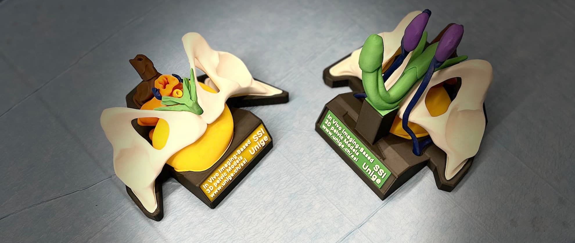 Our team has developed a dismountable 3D kit of the female and male urogenital trigone/small pelvis, including the clitoris and penis, based on morphological measurements by MRI and CT SCAN, for teaching and clinical use; this prototype was published in 2020 in the Journal of sexual medicine (1). The user interviews of the prototype allowed to define a new specification for the development of the V2 kit. The V2 version of the female and male basins are visible below. These two new 3D models were developed on the basis of modified data obtained from Wu et al. in the Netherlands (2), themselves taken from the Chinese visible human project (CVH). The development of the indexing of the parts and the 3D printing was done by Julien Da Costa, techno-pedagogical designer and developer in our team.We are currently working on the V3 which will be available for sale in 2024