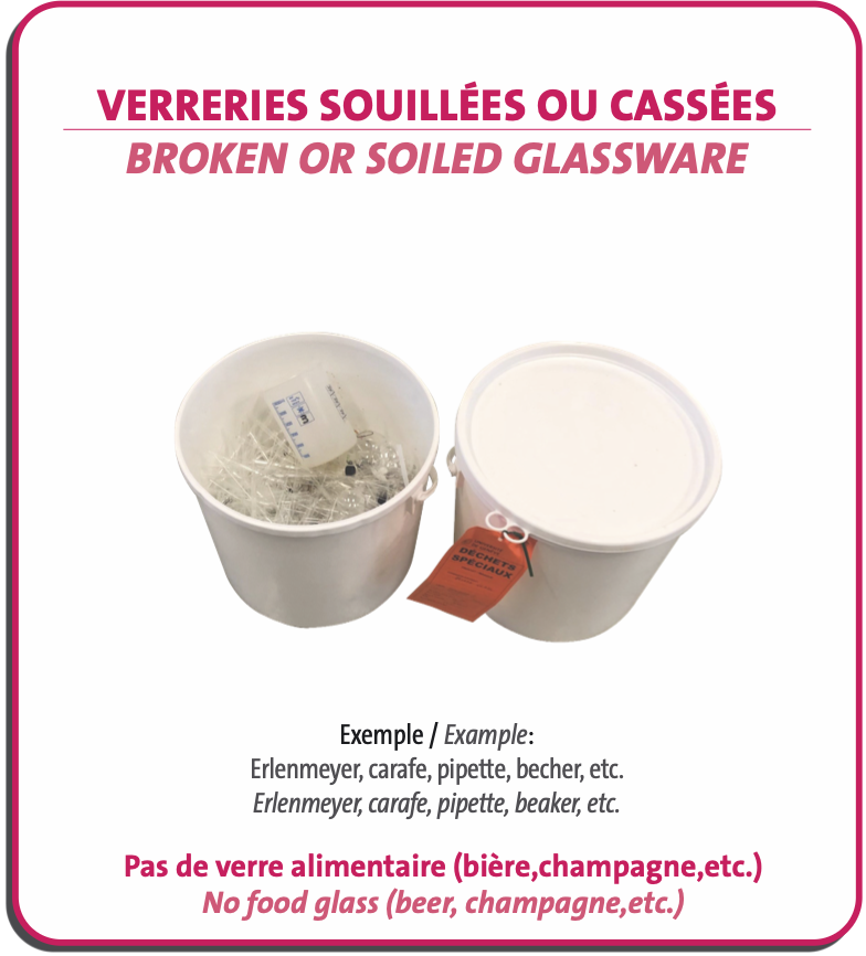 - (valable depuis le 1er juillet 2022) Les déchets solides souillés par des produits chimiques (gants, papier absorbant, etc.) devront être conditionnés dans des sacs transparents ou des seaux blancs (et non plus dans les sacs jaunes).