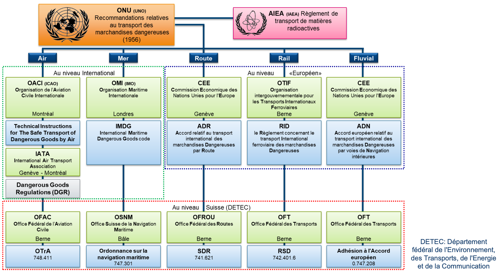 Les transports des marchandises dangereuses sont réglementés en fonction du mode de transport utilisé : ADR camion, RID train, IATA avion et bateau, IMDG).
