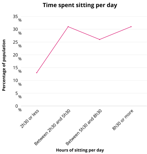 Have you ever found yourself sitting for hours at a time in front of your computer at work or school? This is a sedentary position, characterized by the maintenance of a prolonged sitting posture involving very little physical effort. As the graph below shows, prolonged sitting is not uncommon. It shows the amount of time spent sitting per day in 2015 in Switzerland, for people aged 18 to 75. Moreover, such a position is considered a physical strain, one of the most repeated in Switzerland.