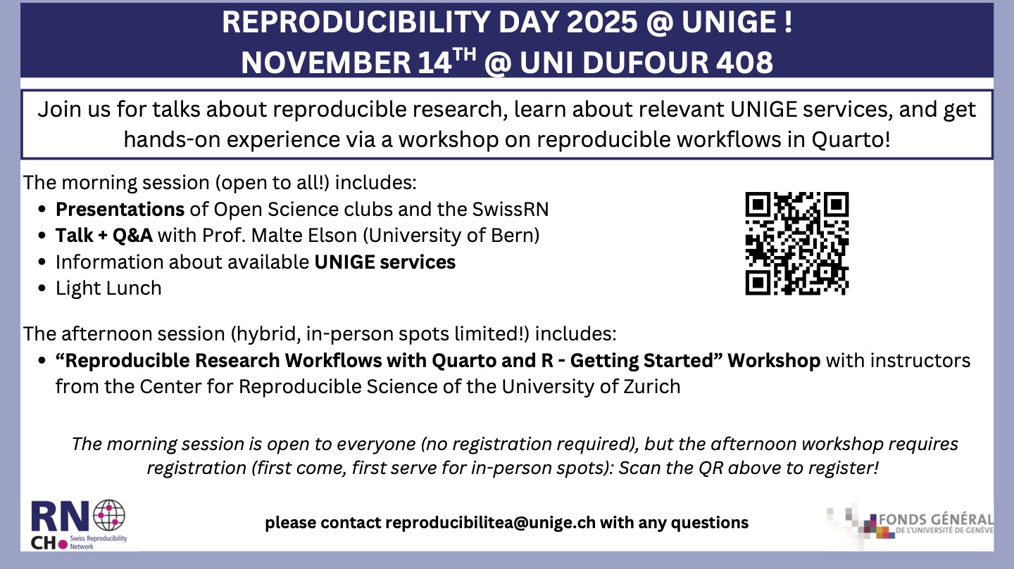 We’re thrilled to invite you to Reproducibility Day on November 14th at Uni Dufour (Room 408) – a full day dedicated to open science (OS) and reproducible research!