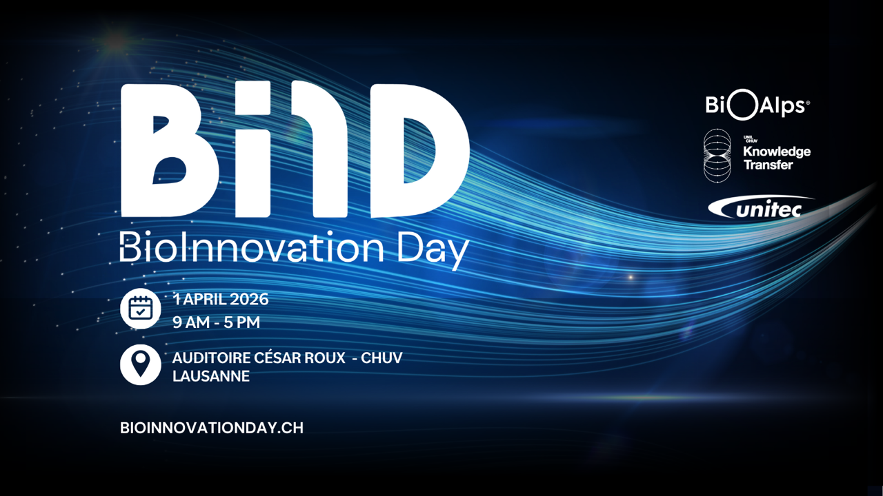 La 11e édition du BioInnovation Day (BIND) aura lieu le 1er avril 2026 au CHUV à Lausanne, un événement phare de partenariat qui réunit des innovateur-trices, des investisseurs, des membres de l'industrie et de nombreux acteurs de l'innovation dans le domaine des sciences de la vie.