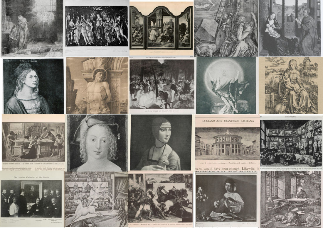 Parmi les résultats préliminaires du projet Visual Contagions, un élément rassemble de nombreux clusters plus internationaux que les autres: beaucoup sont des œuvres d'art. Ces groupes d'images similaires, isolés par la machine parmi nos trois millions d'images récupérées dans des périodiques imprimés des années 1880-1950,franchissent même plus de frontières que les autres.