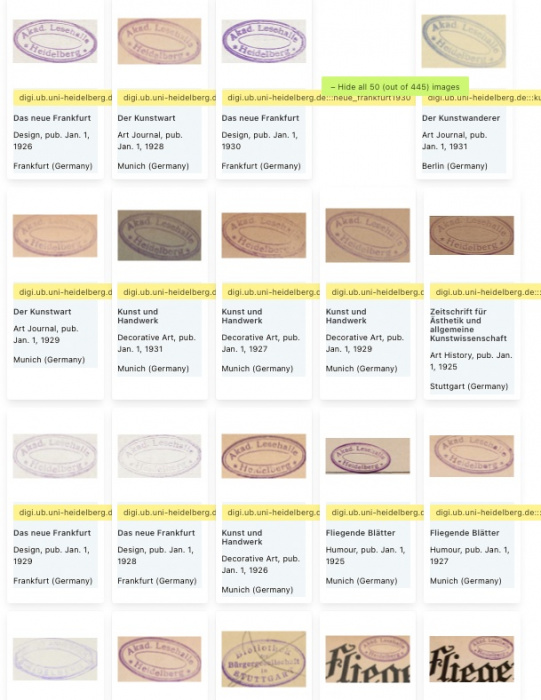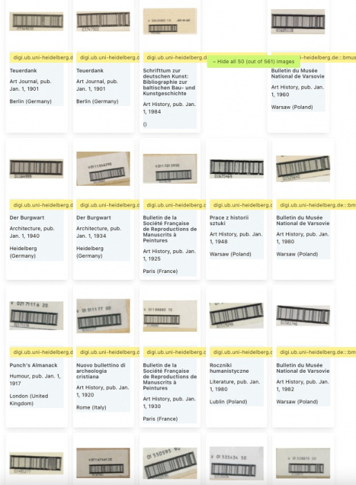 Du moins trouvons-nous dans ces sources les traces des pratiques des institutions les plus équipées, pratiques élaborées de génération en génération et dont la numérisation des périodiques est l'un des aboutissements. Sans ces pratiques internationales, sans ces formats partagés, ces collections complètes, ces données disponibles, le projet Visual Contagions n'aurait même pas pu être imaginé.