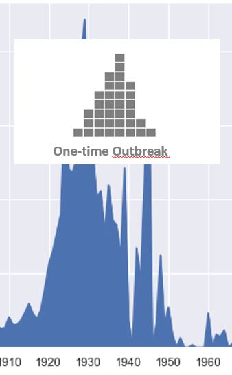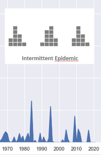 Enfin, lorsque les pics apparaissent régulièrement, on peut penser à une épidémie intermittente, dont les crises sont sans rapport les unes avec les autres. Un exemple : lorsque des aliments contaminés sont vendus puis retirés de la vente. Du côté des bustes, la chose semble se produire pour la seconde moitié du 20ème siècle.